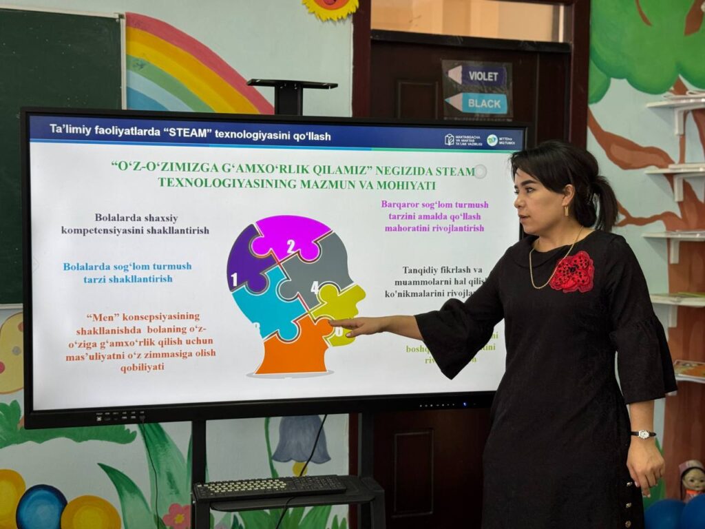 🖇 Treningda Maktabgacha va maktab ta’limi vazirining «Maktabgacha ta’lim tashkilotlarida malaka oshirishning «Metodik mahorat kuni» va «Metodik mahorat soati» tadbirlarini bosqichma-bosqich joriy etish to’g’risida» gi 362-sonli buyrug’i mazmun-mohiyati, pedagoglarni kasbiy rivojlantirishdagi ahamiyati borasida tushunchalar berildi. Shuningdek, «Metodik mahorat kuni» mavzulari doirasida namunaviy amaliy mashg’ulot o’tkazildi.