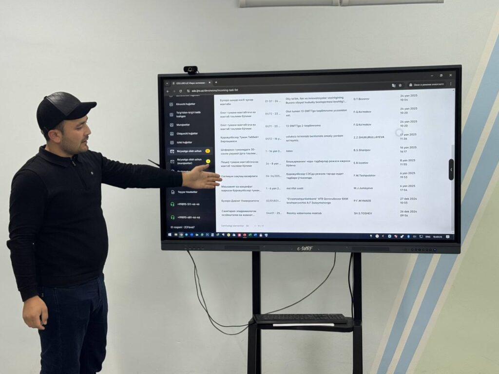 Soha mutaxasisislari tomonidan tizimda ishlash, platformaning afzalliklari, imkoniyatlari haqida ma’ruzalar qilindi, kerakli tavsiyalar berildi. Ma’lumot uchun, edo.ijro.uz ijro intizomi nazoratini ta’minlovchi elektron hujjat aylanish tizimi. Tizim hujjat aylanishi jarayonlarini va topshiriqlar ijrosi nazoratini avtomatlashtiruvchi funksiyalardan iborat bo’lib, bir vaqtning o’zida hujjat ustida bir nechta xodimlarning ishlashini ta’minlaydi.