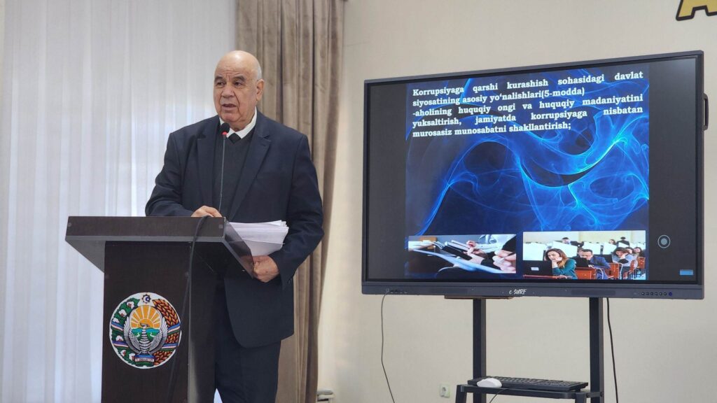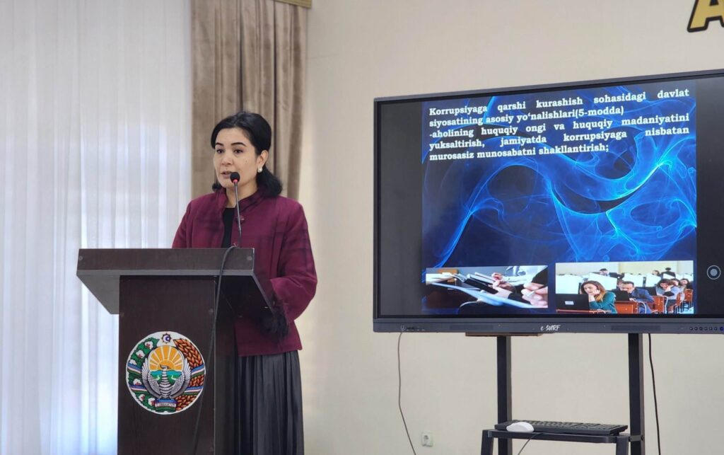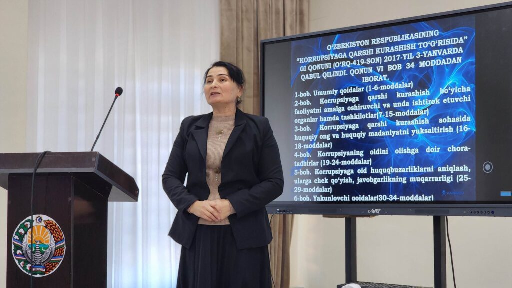 Unda korrupsiyaning jamiyat va davlat hayotiga zarari, ushbu illatning oldini olish va uning turmushimiz va kelajakka salbiy ta’siri haqida ma`ruzalar qilindi.