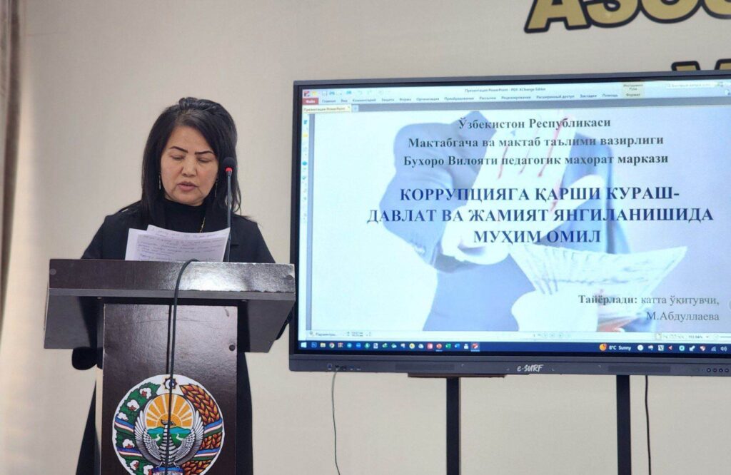 Joriy yilning yilning 1-noyabridan 1-dekabriga qadar «Korrupsiyaga qarshi kurashish oyligi» doirasida Buxoro viloyati pedagogik mahorat markazida «Korrupsiya-jamiyat rivoji kushandasi» mavzusida oʻquv-seminar boʻlib oʻtdi.